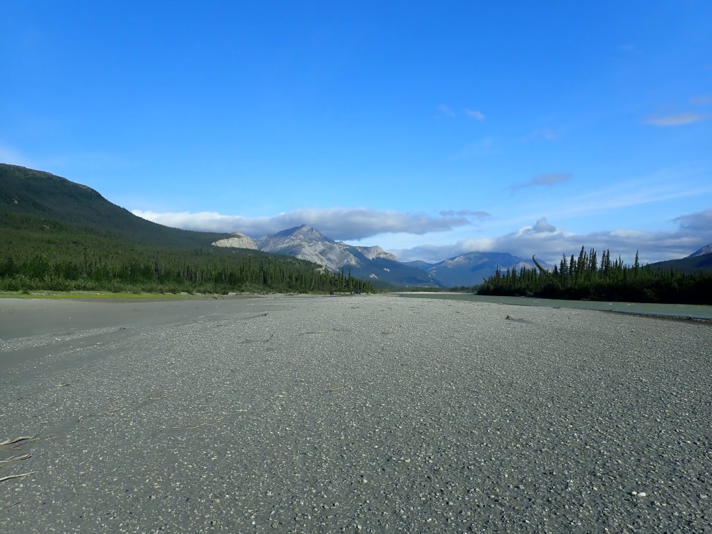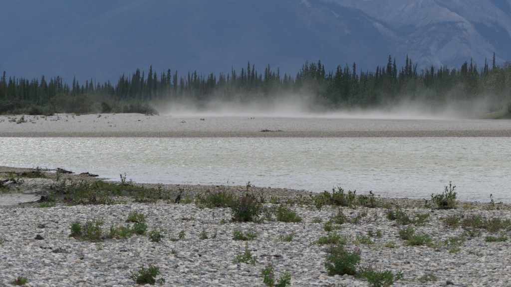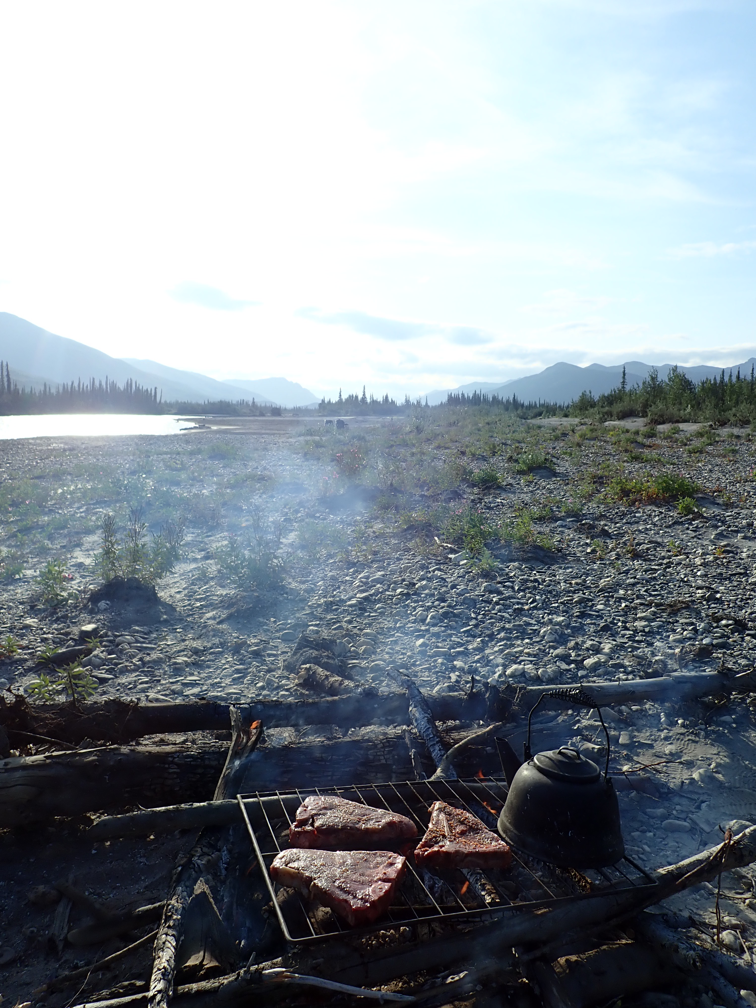 As you can already see, the weather is once more getting better in the evening, and after a short walk exploring our gravel bank we have a nice dinner: grilled steak and mashed potatoes.