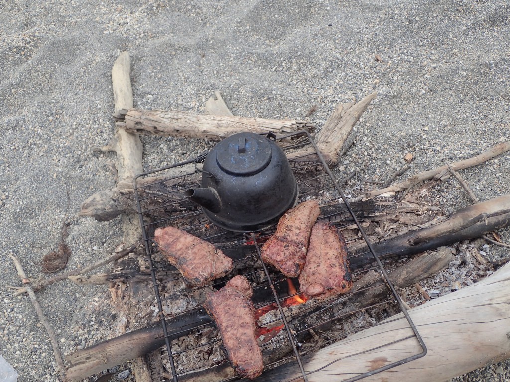 After deciding to camp here (the mountains around us are starting to vanish in the smoke), we call Peter to be sure that the fire is not to close (we are fine). Then the same routine as every day since Saturday- pumping water and cooking steaks!