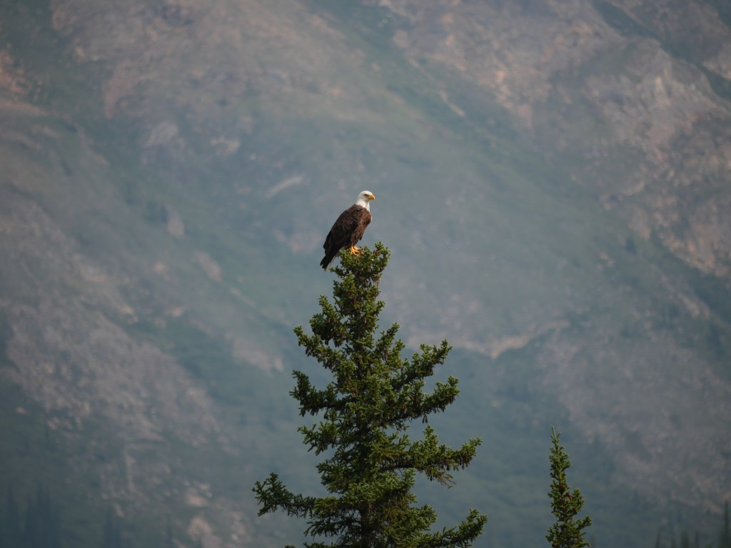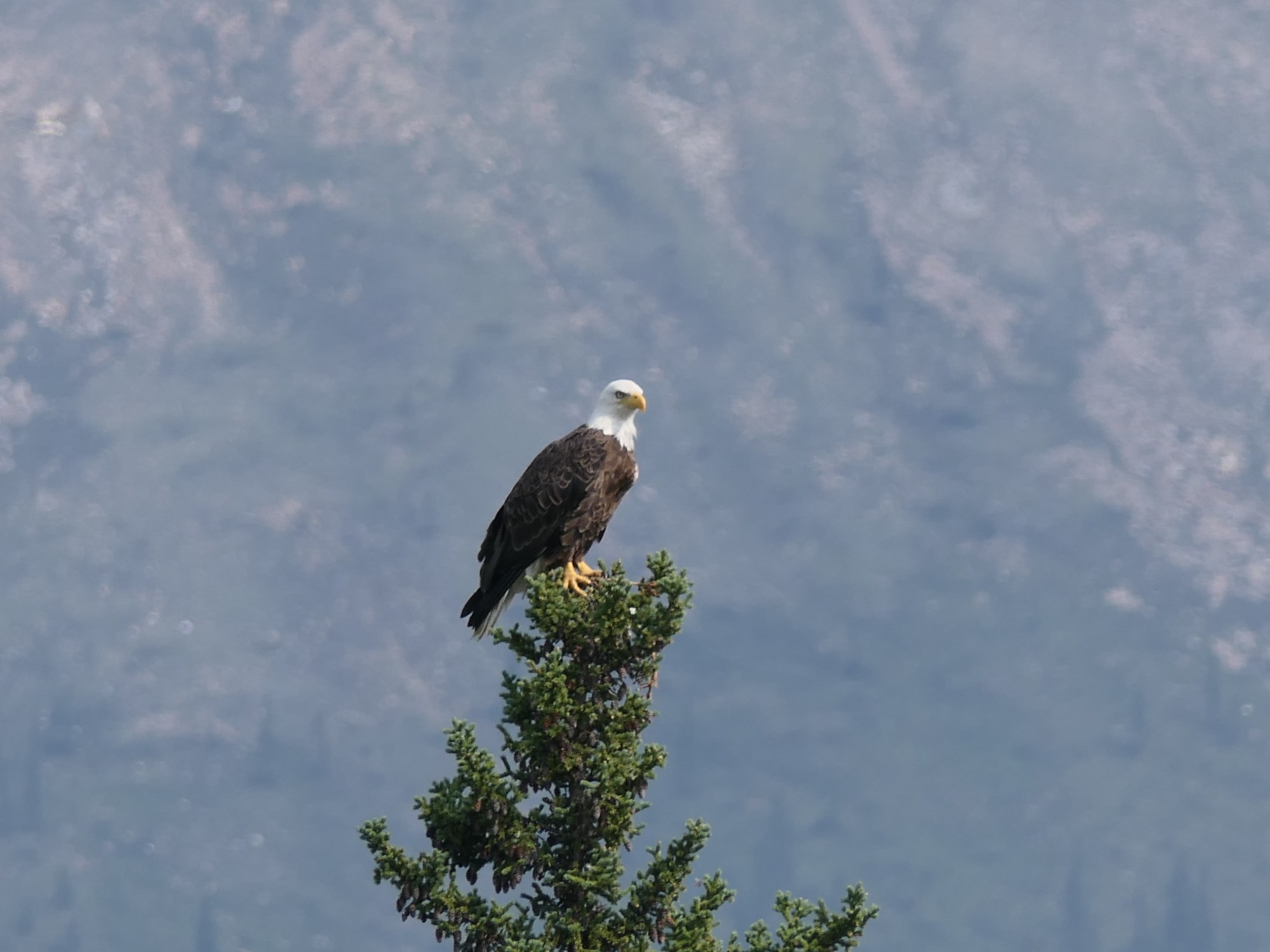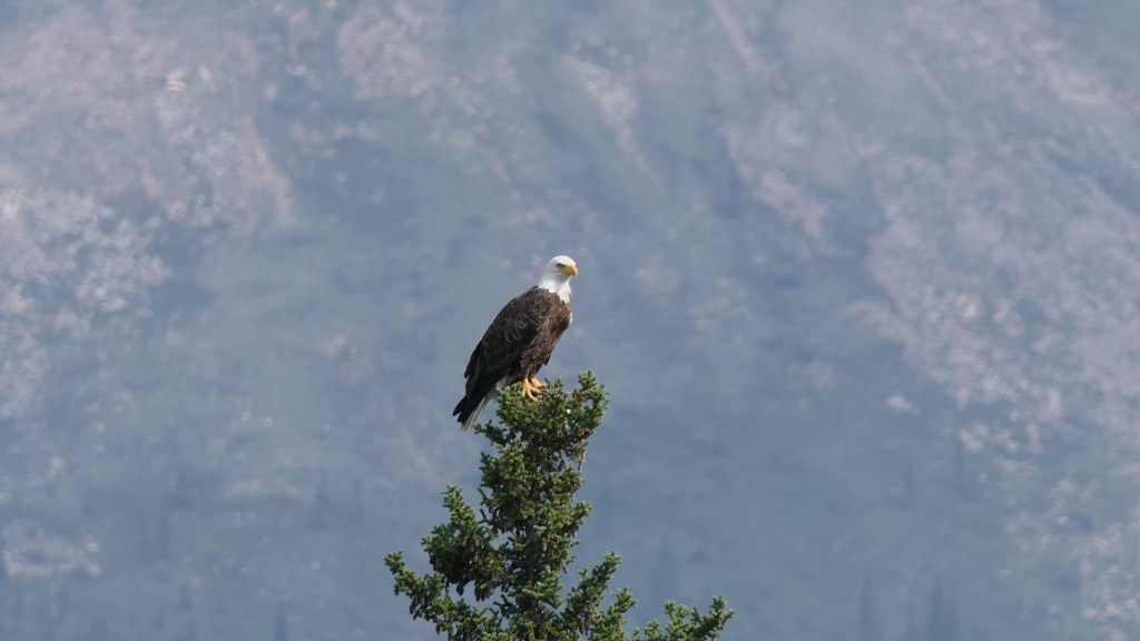 It’s already around 4 pm when we spot a bald eagle just sitting on a tree near a confluence with a small stream.