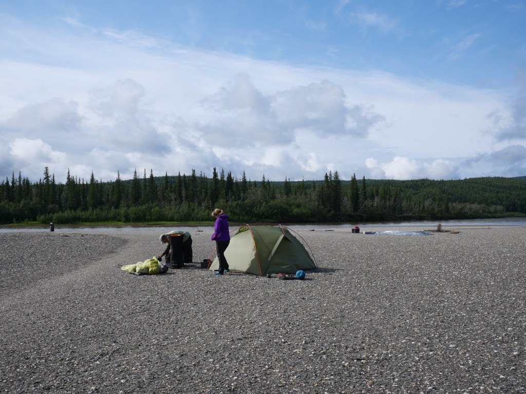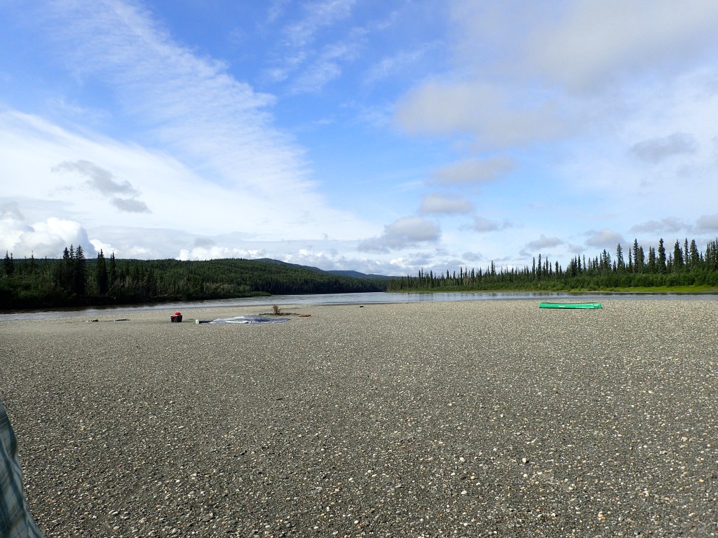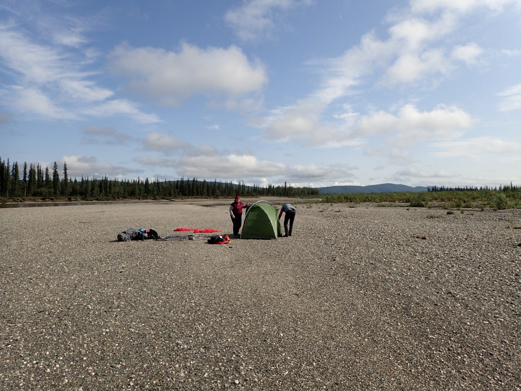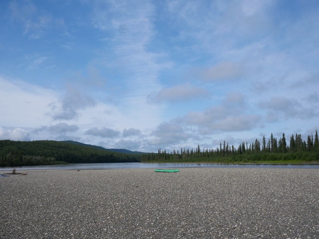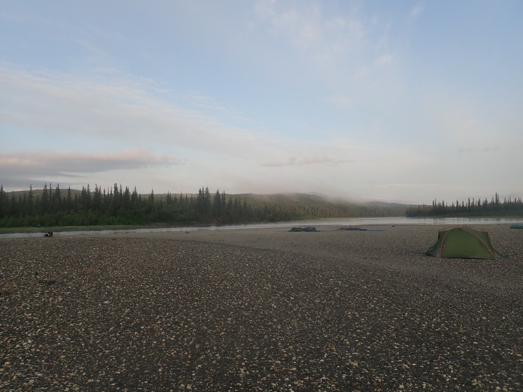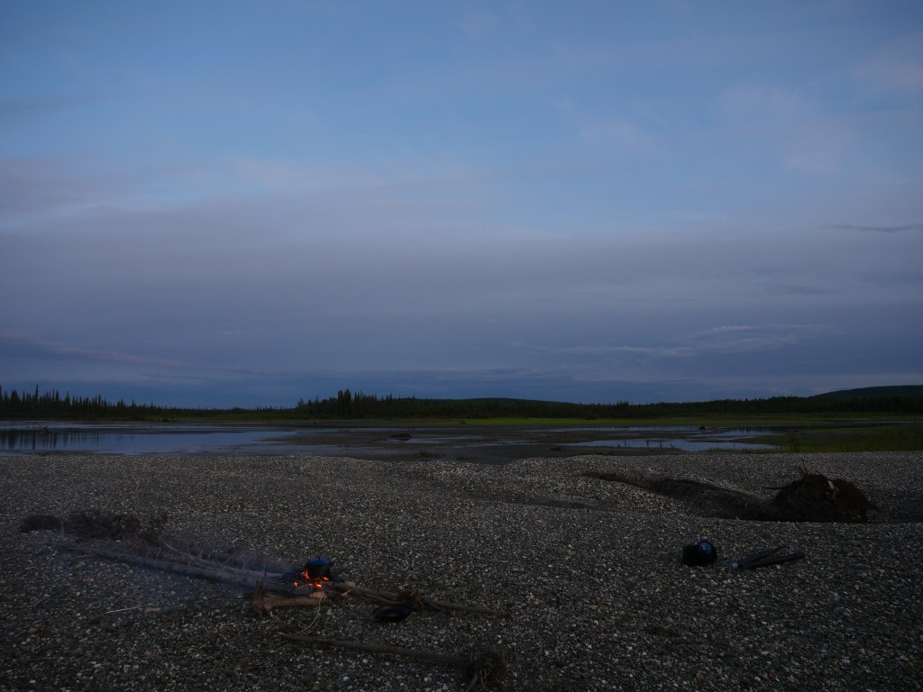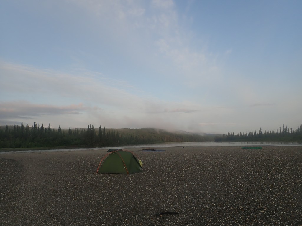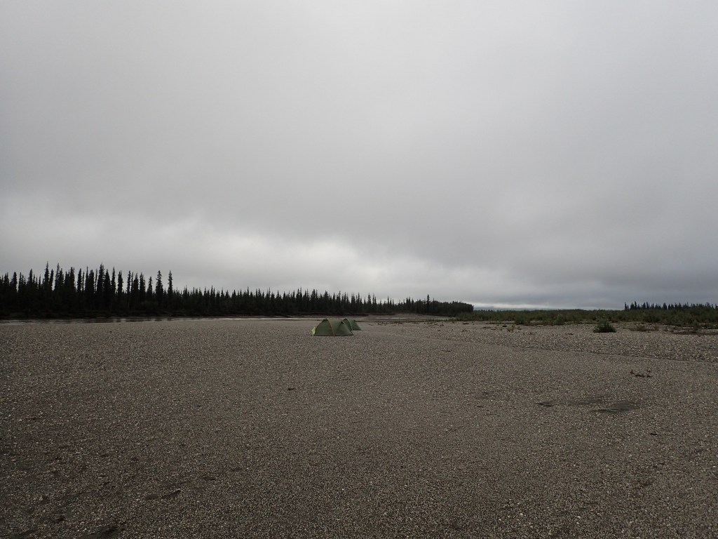 At one point according to the map the river should turn right but has once again decided to go straight. That’s where we find one of our most beautiful camps. A nice and high and big gravel bank.