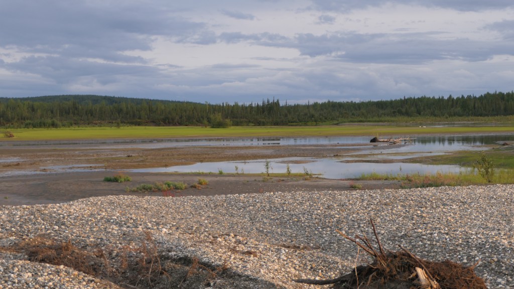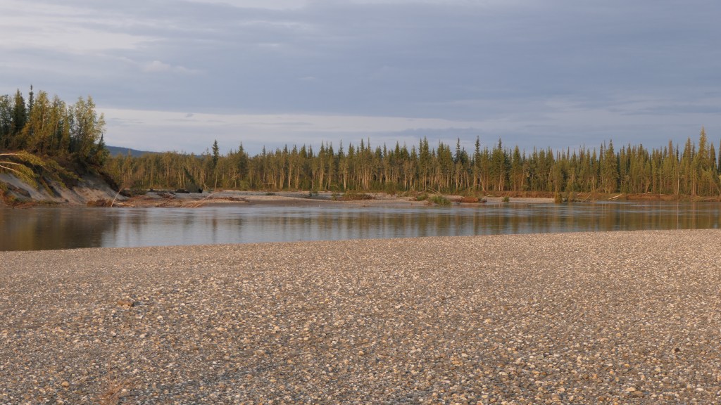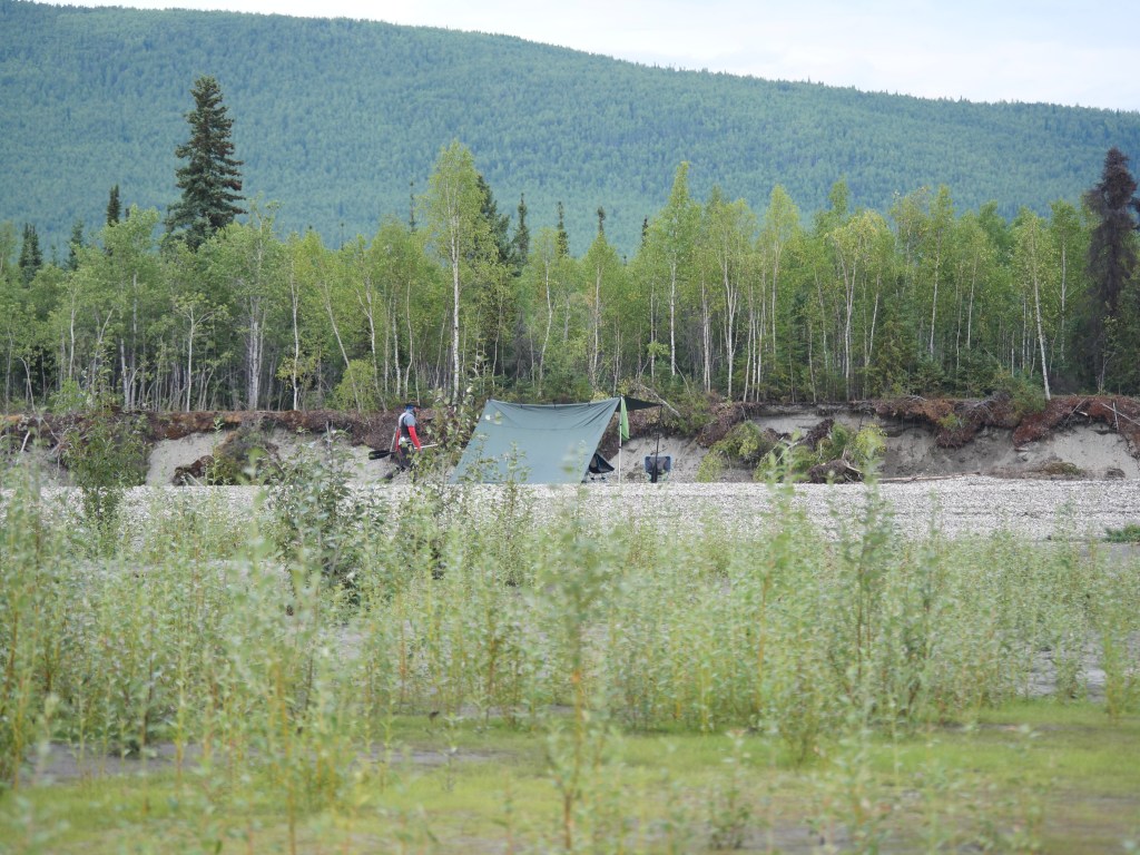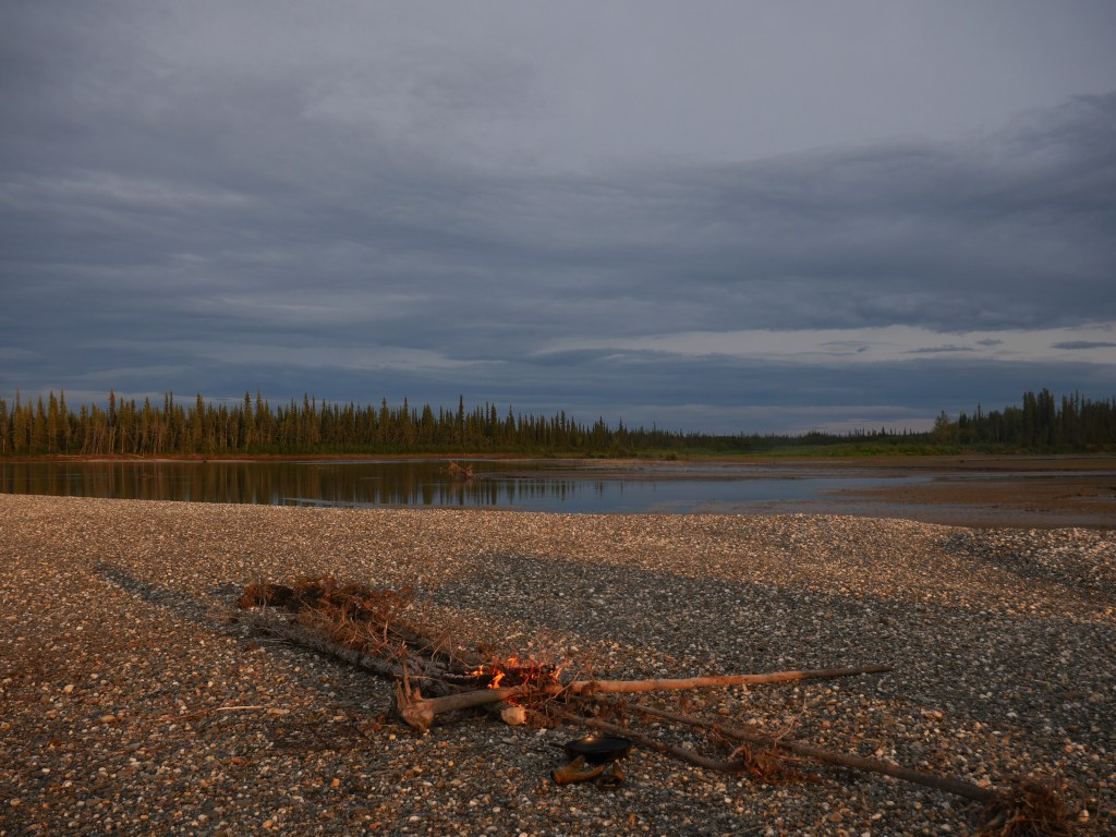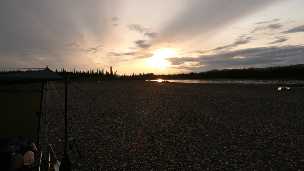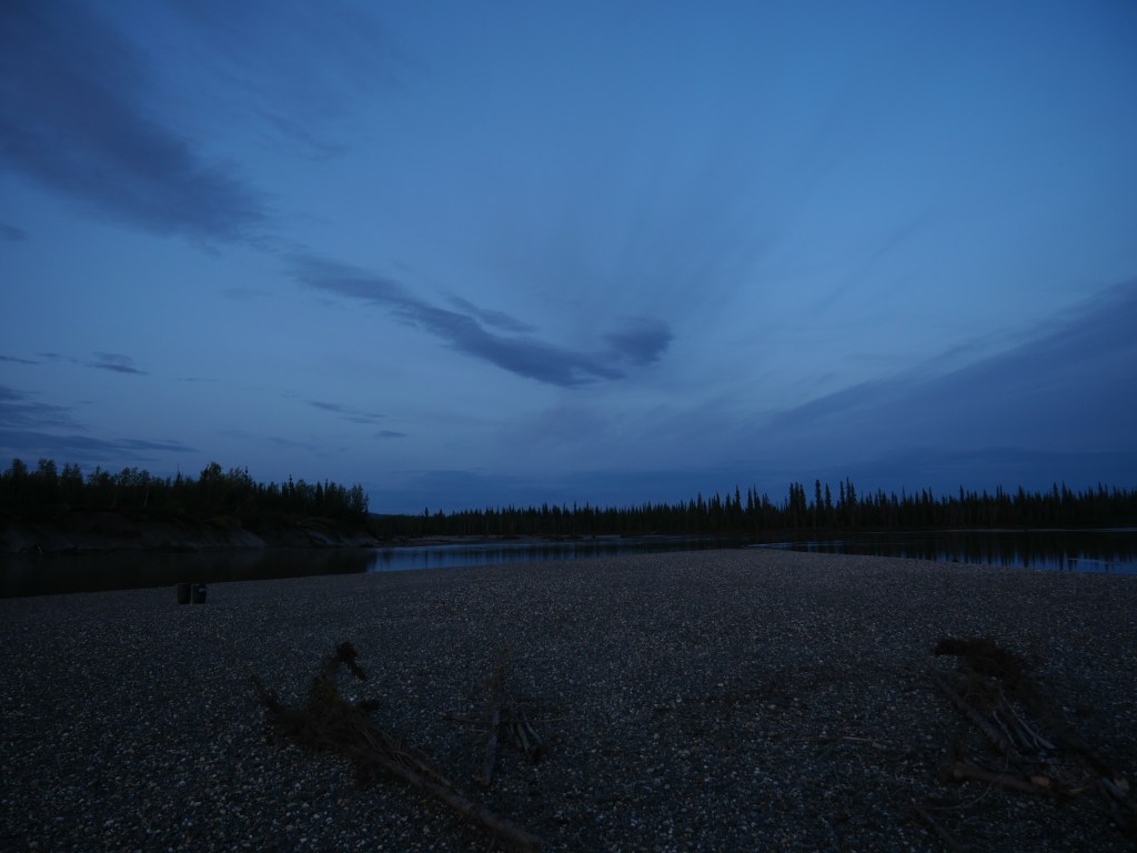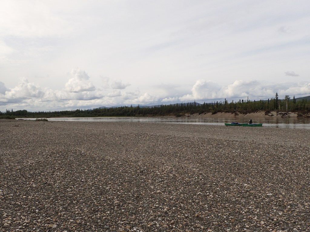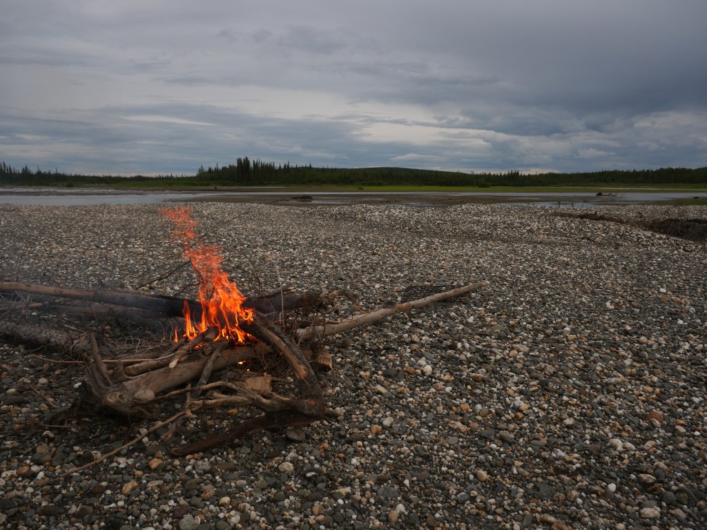 At one point according to the map the river should turn right but has once again decided to go straight. That’s where we find one of our most beautiful camps. A nice and high and big gravel bank.