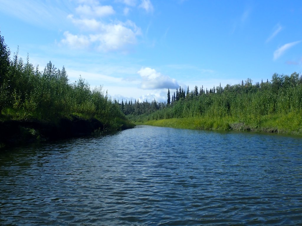 Not long after having left camp we decide to explore a small arm of the river – the water there is crystal clear.